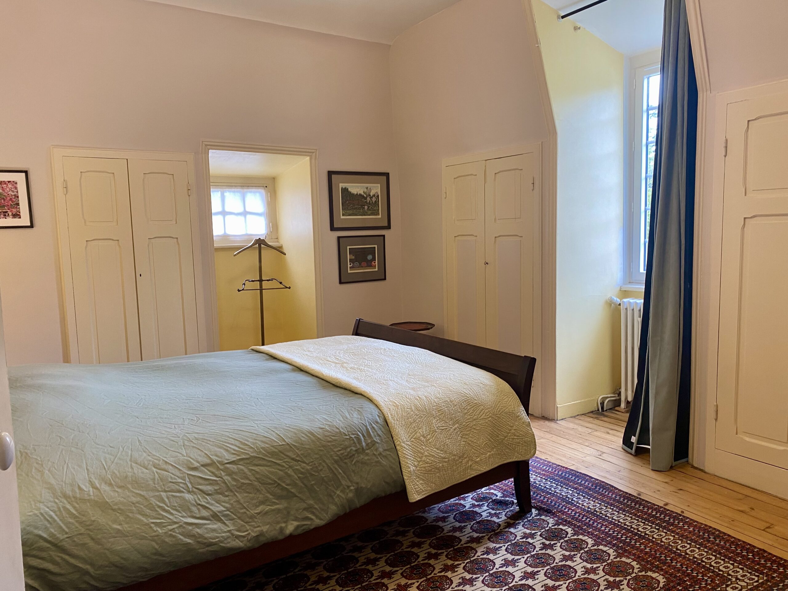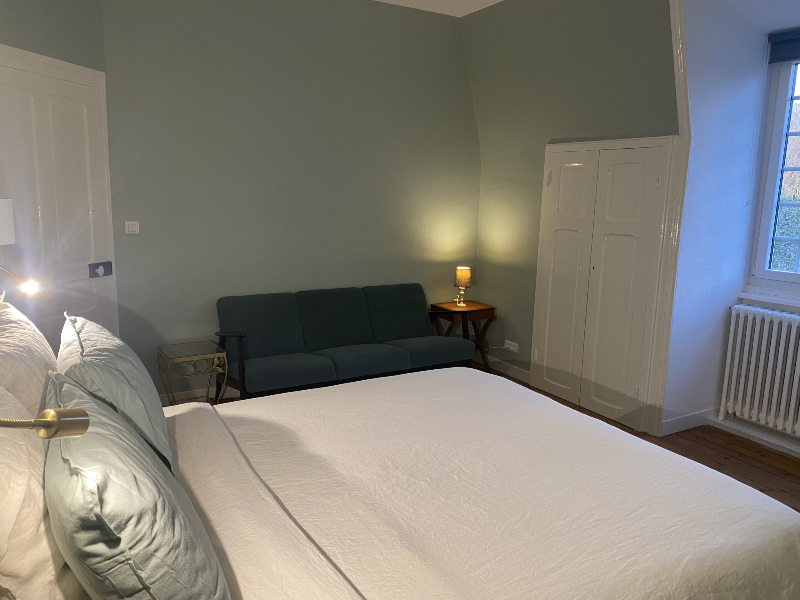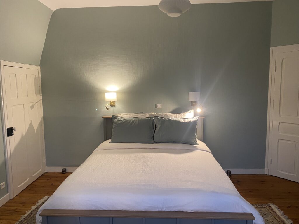 La chambre offre une double exposition : à l’est, vue sur le vaste parc arboré ; à l’ouest, sur l’aire de jeux et les prés environnants. Prévue pour deux personnes, elle peut également accueillir un jeune enfant sur demande.